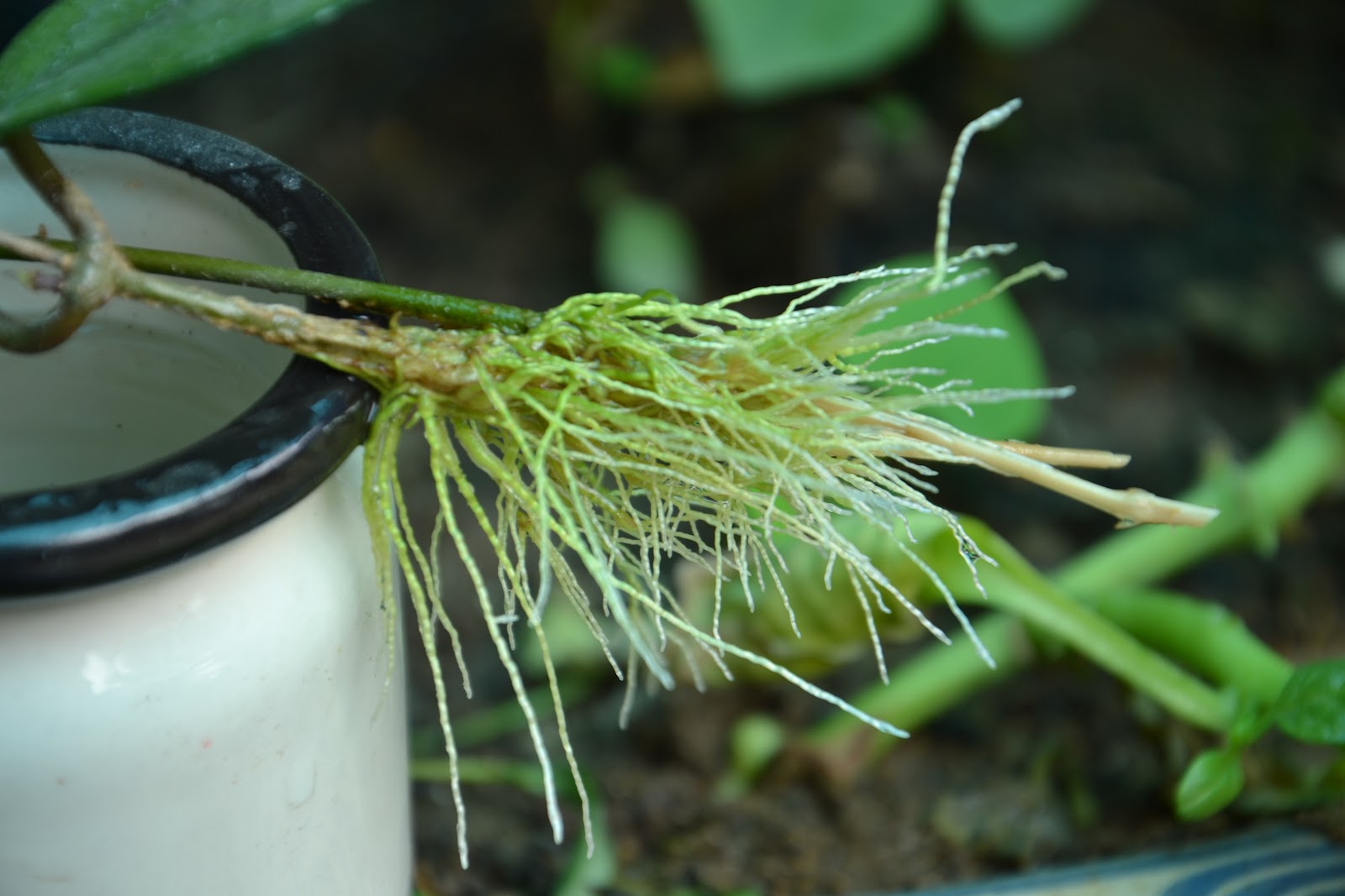Cho đến hôm nay khoảng 45 ngày rồi, hihi, ngó cái cốc thấy búi rễ trắng đã dài, và trên mỗi cành đều nhú tược non rồi, khỏe re. Vậy là trong 45 ngày qua tớ cho các bạn ấy uống măm măm B1 2 lần và thêm vài lần thêm nước nữa, đến nay có thể nói cái sự liều và tham lam của tớ đã được trả công xứng đáng.