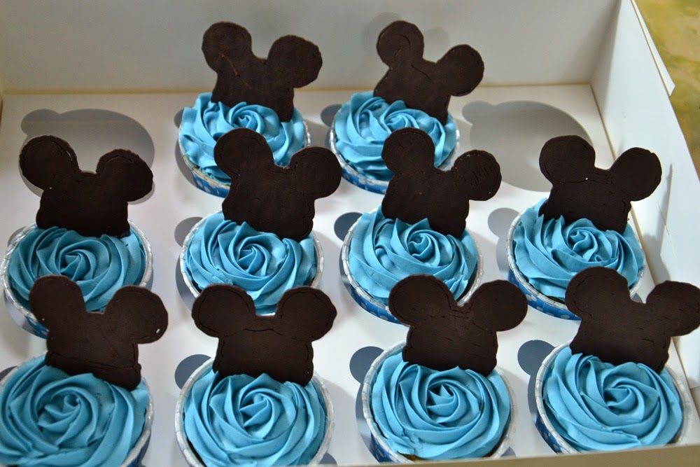 Đơn hàng của chị kèm theo cupcake muốn cho cùng tone với bữa tiệc tớ đã chọn mẫu đơn giản và dùng mickey chocolate làm điểm nhấn cho mỗi chiếc cupcake.